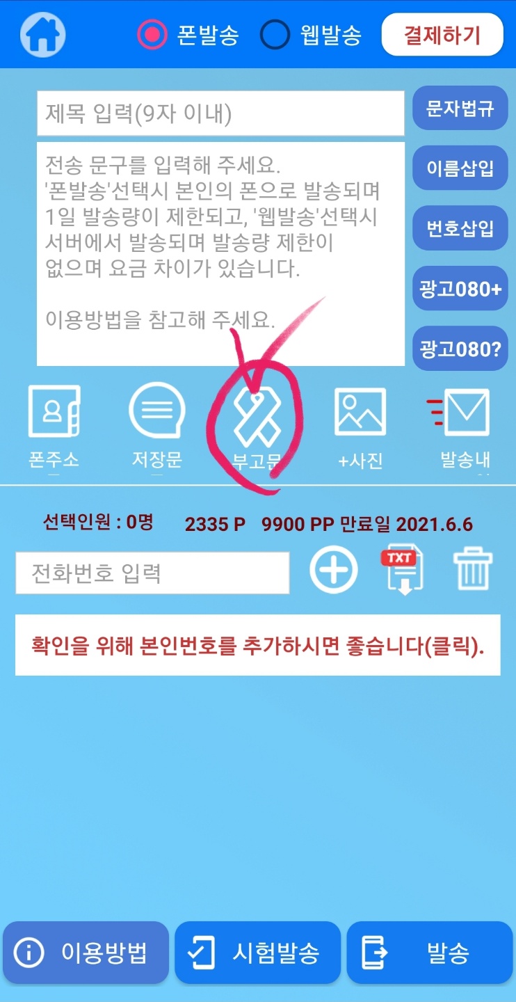 1. 폰발송 : 하루 480건 제한(문자 무제한 요금제 이용자)